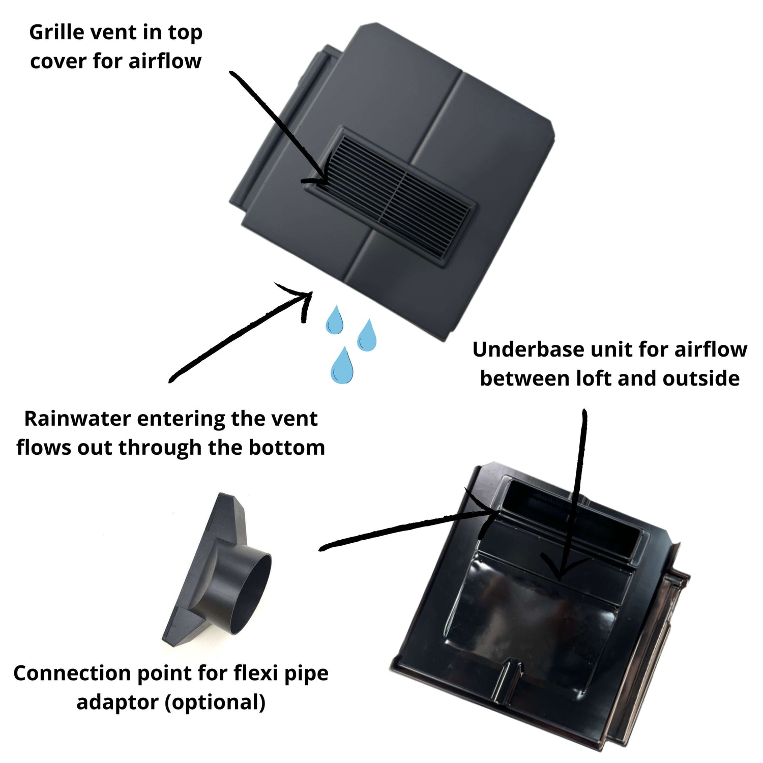 Any rain that enters the vent is channeled down through the bottom and onto the roof tiles below (always keeping it above the roof level).