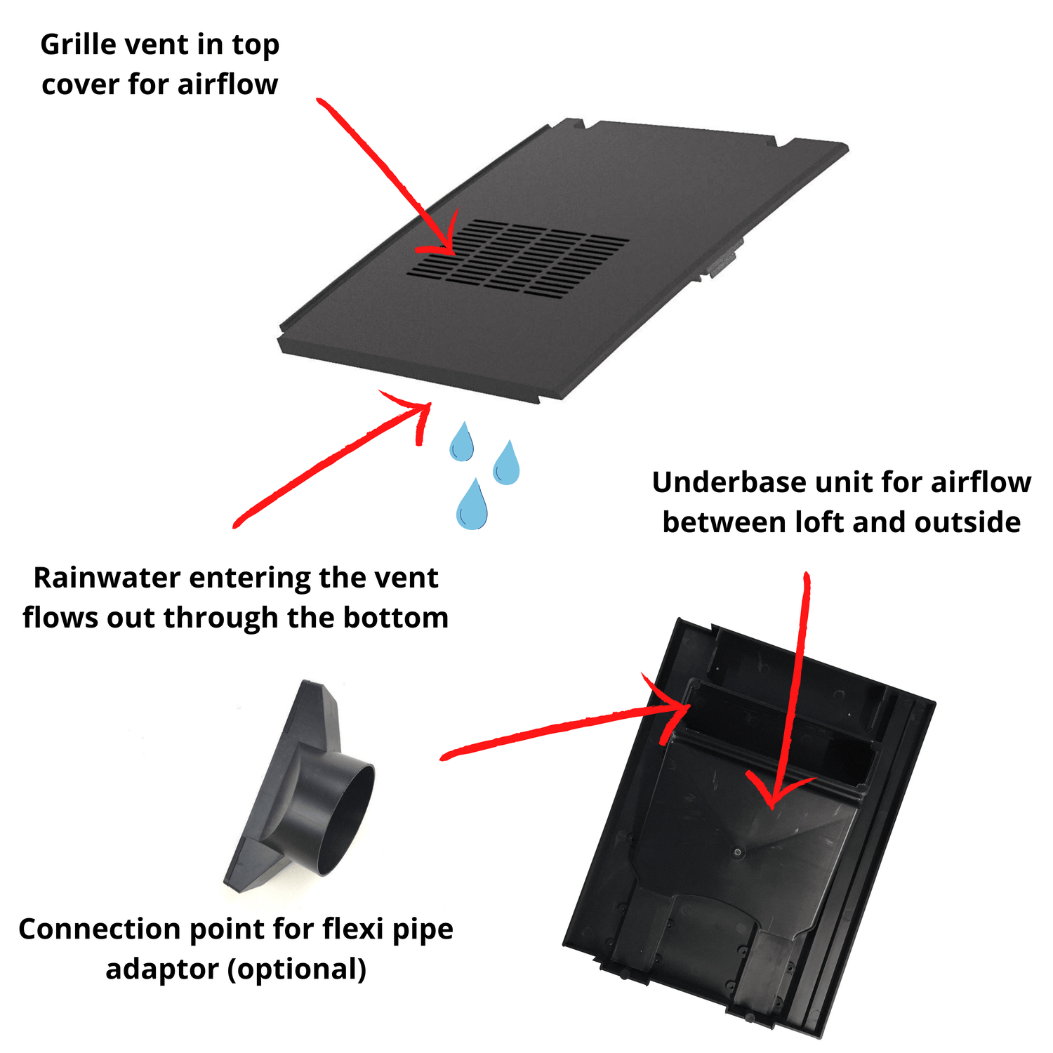 Any rain that enters the vent is channeled down through the bottom and onto the roof tiles below (always keeping it above the roof level).