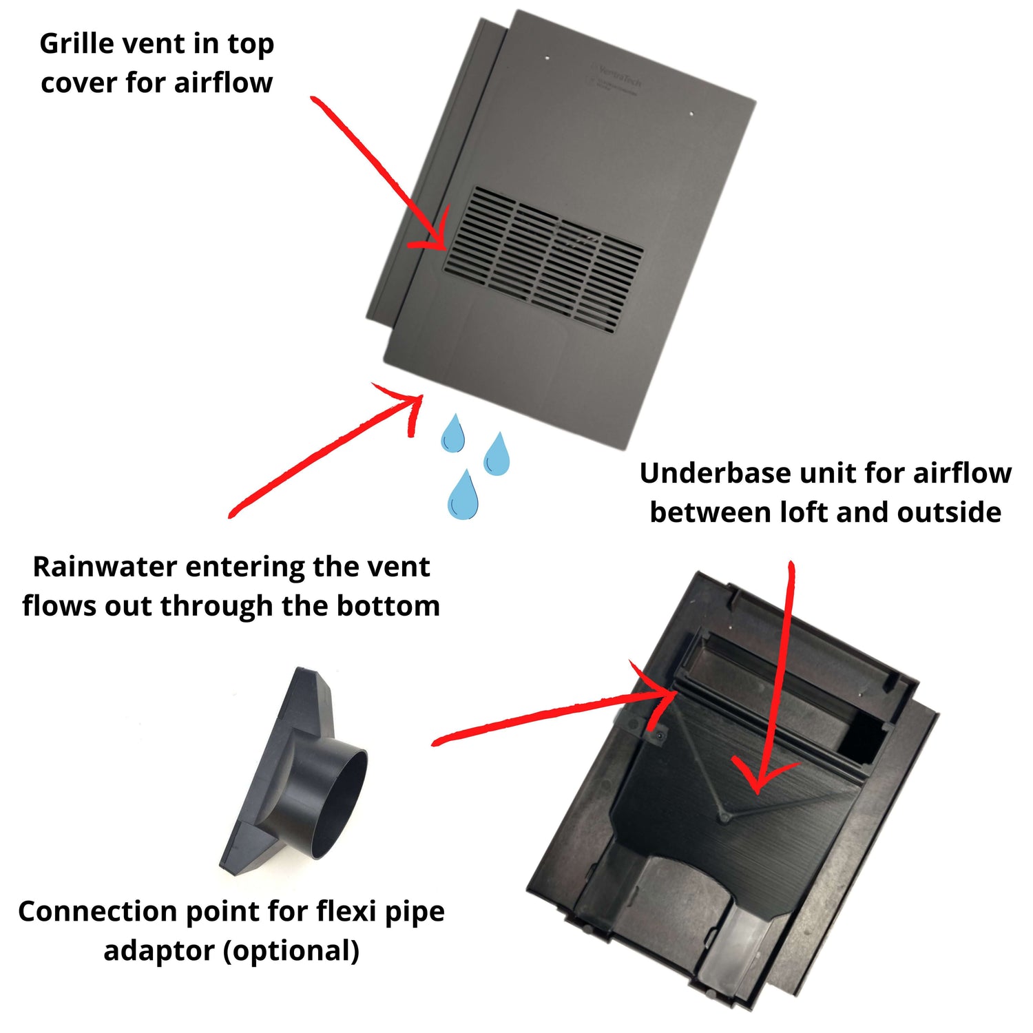 Any rain that enters the vent is channeled down through the bottom and onto the roof tiles below (always keeping it above the roof level).