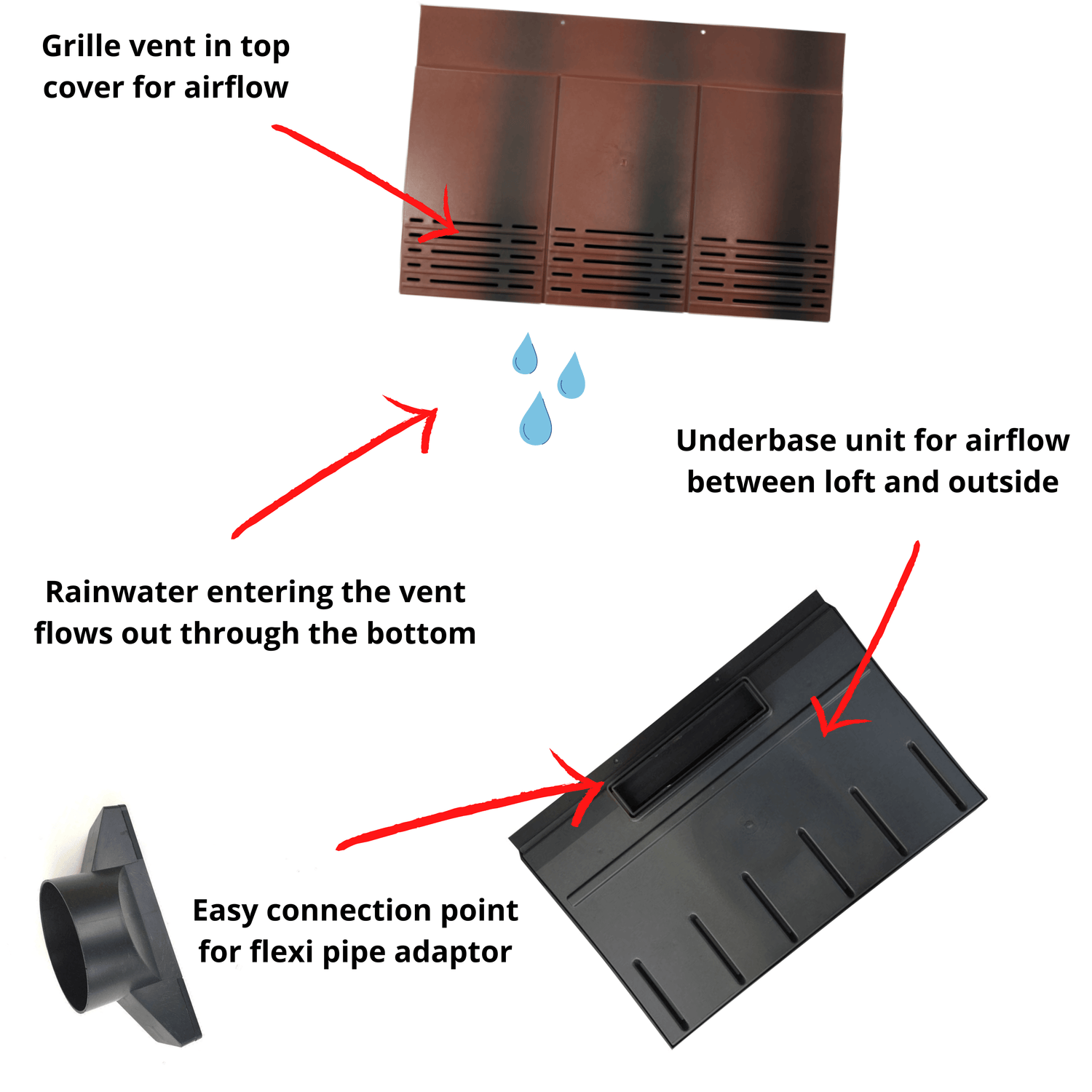 Any rain that enters the vent is channeled down through the bottom and onto the roof tiles below (always keeping it above the roof level).