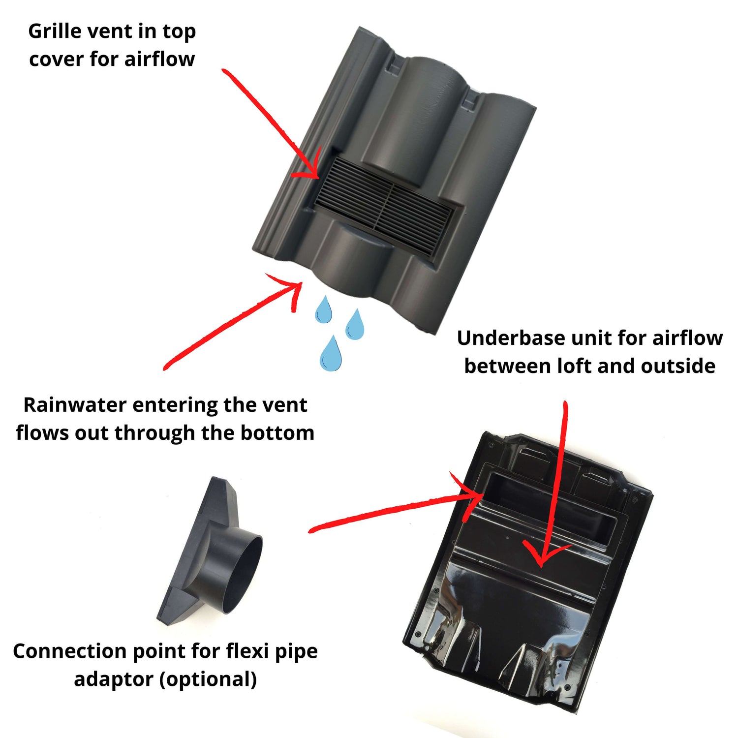 Any rain that enters the vent is channeled down through the bottom and onto the roof tiles below (always keeping it above the roof level).